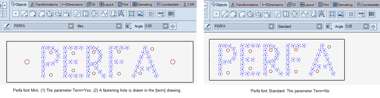 NOTE: If the perfa font does not use fasteners — for example, a Standard perfa font — there is no need for you to draw anything in the {term} drawing. In this case, the value of the parameter Term must be No. See the following picture for how a MINI perfa font (left) uses fastener plates and how a Standard perfa font (right) does not.