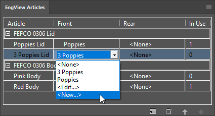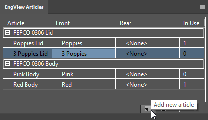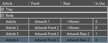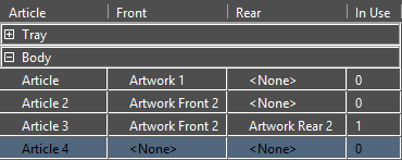 NOTE: In a drawing, you can create an article (1) by copying the artwork of an existing article or (2) without copying any artworks. For (1), select the drawing's tab, and then click New Article . The newly created article will not have any artworks selected for its front and rear sides — in their cells you will see <None>. For (2), select an existing article, and then click New Article