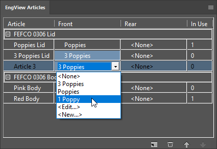 After you have switched the article, notice that in the EngView Articles panel the dot that indicates the currently applied article has moved to the newly applied article.