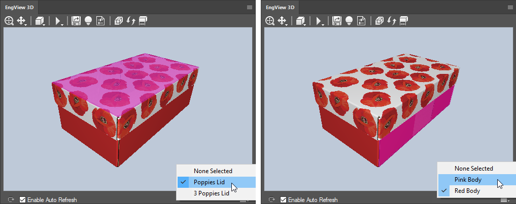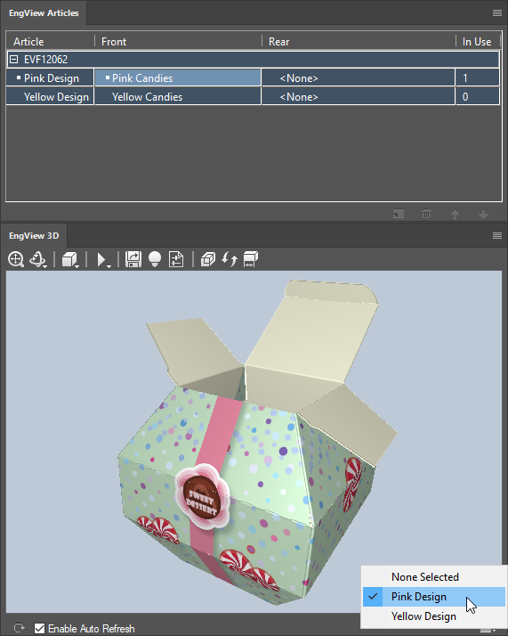 When you add graphical content to an artboard, it visualizes automatically in the EngView 3D panel — the artwork is attached to the article being visualized.