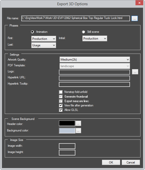 Image Size The image against which the 3D model is rendered. To set an image, close the dialog box, go to Package Designer's 3D model, and then set the image in the View Options dialog box.