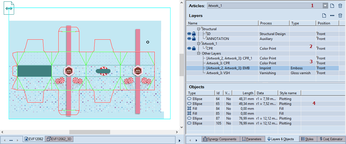 The following graphics show how artworks are visualized in the 1up and 3D drawings.
