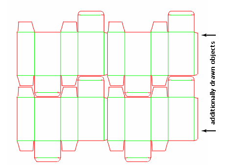 In the layout drawing, two lines have been added to the layout by hand. In the 1up drawing, the corresponding line is missing. |