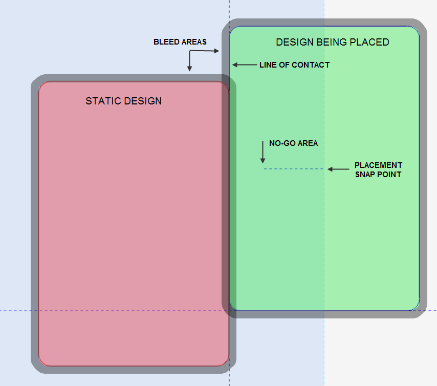 The following picture describes how edge detection works. The green design is being placed along the red one. NOTE: The design placement is done along the designs' cut lines; the bleeds are not taken into account.