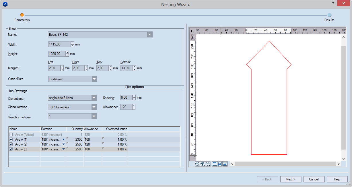 The Nesting Wizard dialog box opens at the Parameters page.