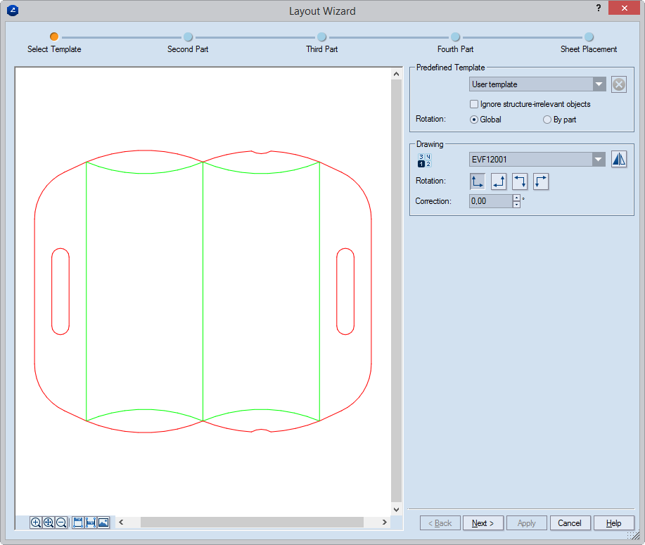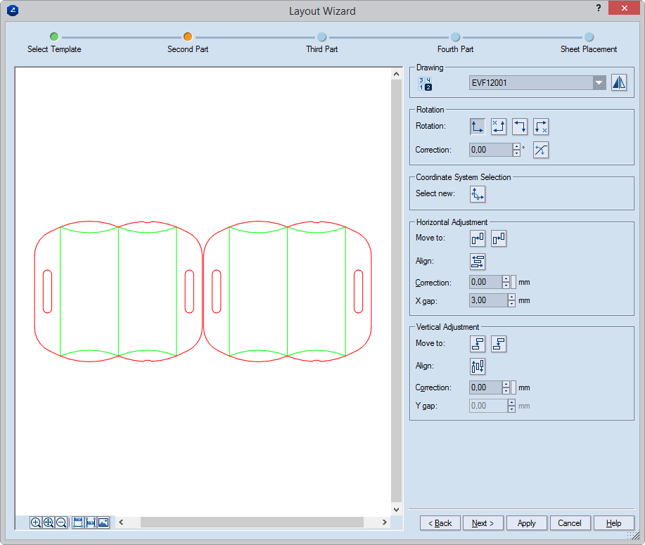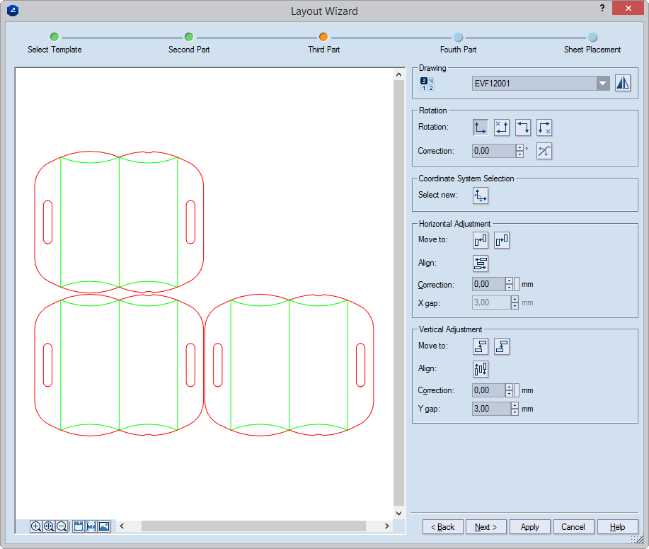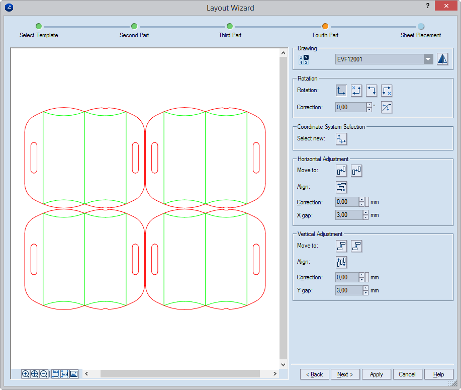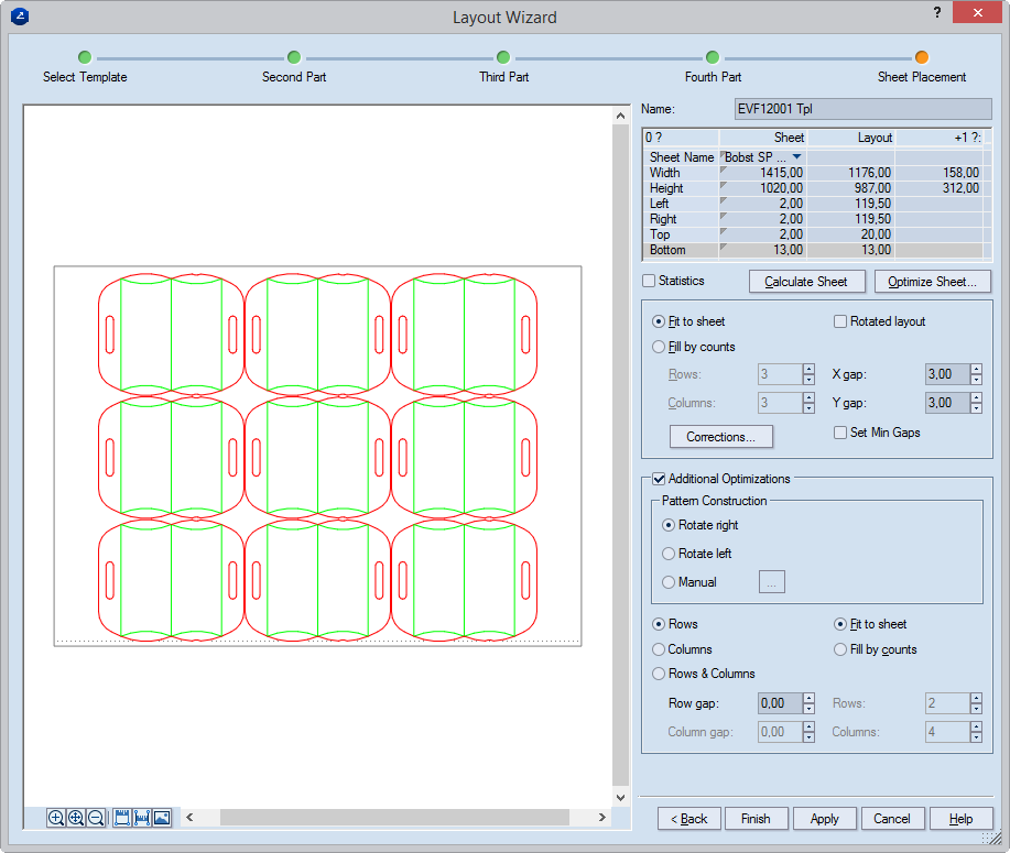 Run layout wizard This layout technique sets rules for the arrangement of four layout parts in two rows and two columns. You then select a rule, and the program follows it to populate a selected sheet with layout parts. Using waste area-based statistics, you can control how the program applies the selected layout template onto different sheet sizes.