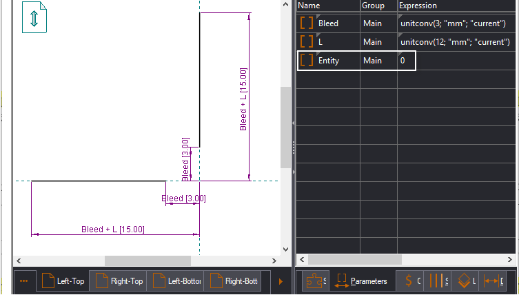 IMPORTANT: All EngView-distributed standards are parameterized — that is, resizable components were used as basis for them (pictured in the left drawing), whose sizes are controlled by parameters (pictured in the right drawing). Note how two parameters are used to control the distances of the bleed (Bleed) and the print mark's length (L).