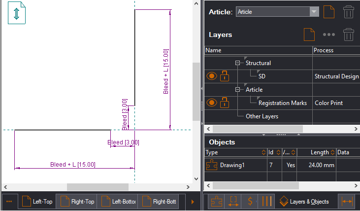 Print mark standards are .evd files that contain drawings of each print mark that you want to position. The following picture displays the Crop Marks standard, which comes automatically with your installation. The standard contains four print marks, each of them in its own drawing — Left-Top, Right-Top, Left-Bottom, and Right-Bottom.