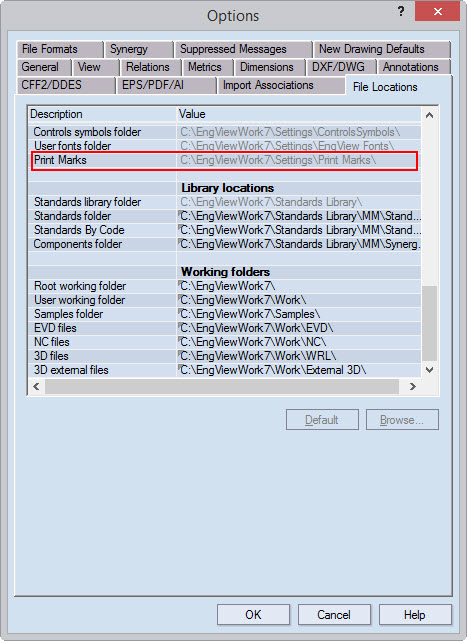 To locate the Print Marks folder, on the Tools menu, click Options, and then click the File Locations tab: