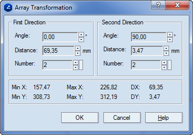 Distance Sets the step of the representations of the selected objects in the second direction of multiplication. Negative values result in arranging the array objects in the "reverse" direction along the auxiliary axis of representation. Value range: [–25400.00 mm, 25400.00 mm]; or, in inches: [–1000.00, 1000.00].