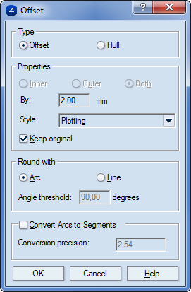 Round with Specifies how offset and outer hull angles will be rounded. When you are drawing an offset to the outer side of an angle or an outer hull to objects that form an angle, the resulting angle in the offset/hull object must be rounded so that the vertex of the original angle is at the same distance from all the points that belong to the rounded angle (when rounded with an arc), or from the angle-clipping line segment, respectively.