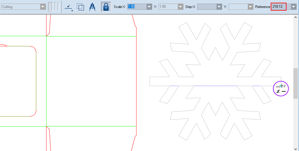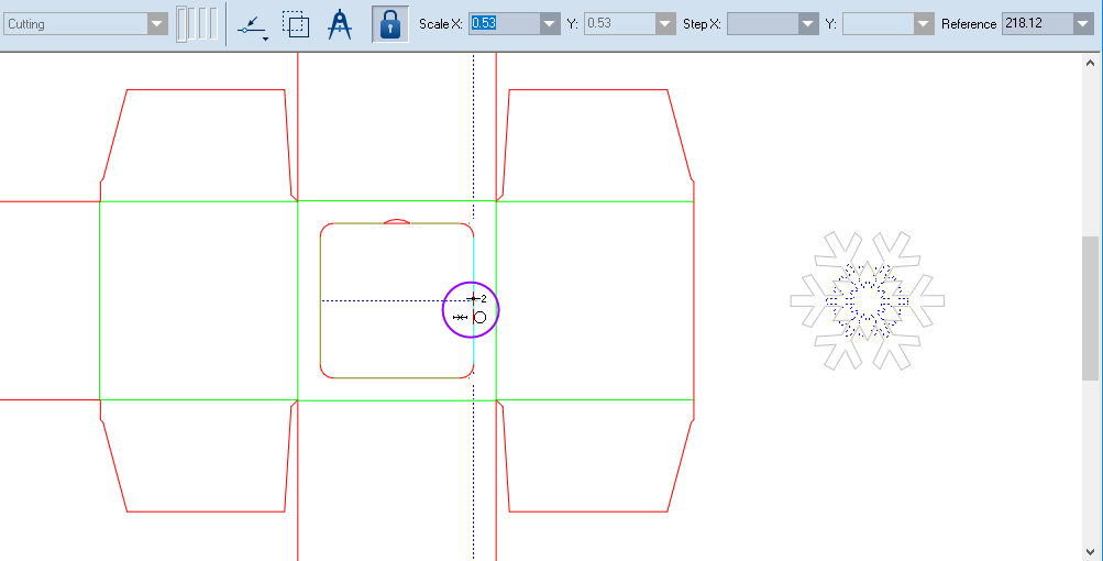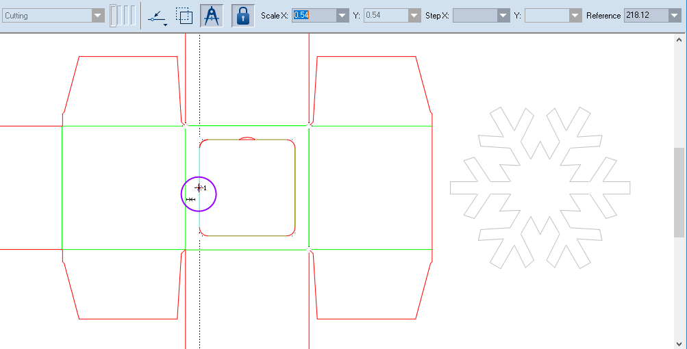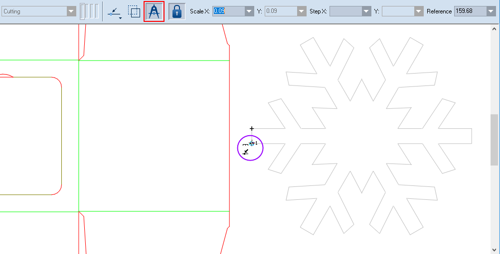 This technique scales a selection by extracting a reference by the distance between any two clicks and making it equal to a target distance. There are cases in which no suitable object exists to use as a reference for the drawing you want to scale. In such situations, you can use as a reference the distance between two control points (including a middle point). Follow the technique that follows, in which a snowflake fits a perforated hole (pictured).