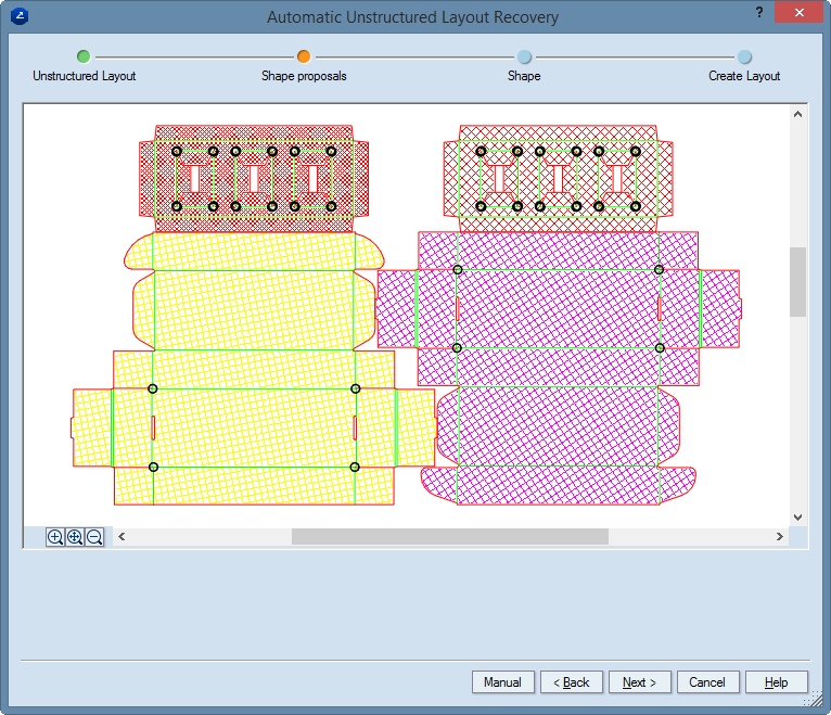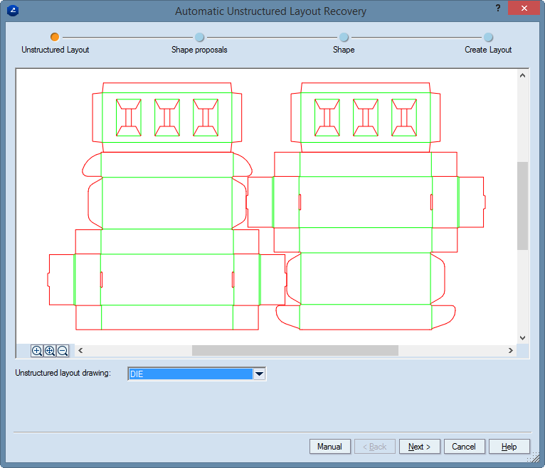 For the successful automatic layout recovery of an imported file, it is critical that the outer contour — the continuous contour formed by the outer objects of the original layout drawing — is both closed (that is, there are no gaps in it) and in the Cutting style.